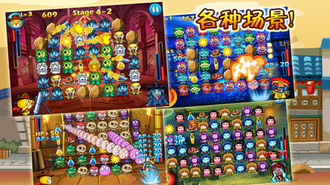 游戏和其他的三消游戏玩法其实差不多,需要玩家在游戏画面中找出类型相同的妖怪,把两个妖怪的位置互换形成三个或者三个以上相同的妖怪之后就可以消除掉。比较有意思的是本作在这个玩法的基础上加入了回合制战斗的游戏元素,让游戏的玩法更丰富,更具有挑战性了。